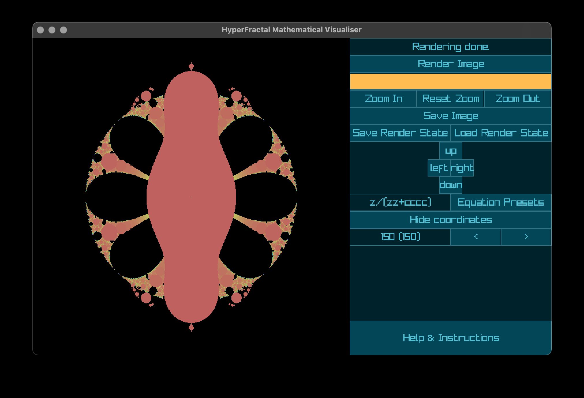 HyperFractal is an interactive GUI fractal renderer tool written in C++. it allows you to pan/zoom around a selection of well-known fractal equations, input your own custom equations which are parsed at runtime, change the colour scheme and iteration count, and save rendered images and configurations to a database.