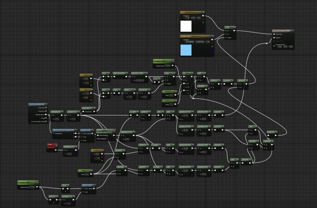 by far my largest area of contribution was technical art. i managed importing assets from the 3D artists, including establishing a shared pipeline and to ensure that assets matched and looked coherent when combined in game. i developed a standard PBR shader with albedo, normal, and roughness-AO-metallic texture inputs. i also managed generating LODs for improving performance.