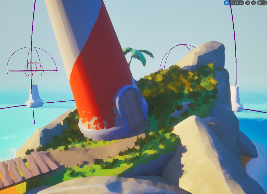 late in development i added foliage to the islands in the game, as some additional set dressing. this was aided by excellent work from Cloud, who provided a set of masked grass texture variations which i then fed into Unreal's foliage system. i made a mixture of green and yellowish grass, tall and short, sparse and dense, to give variation.