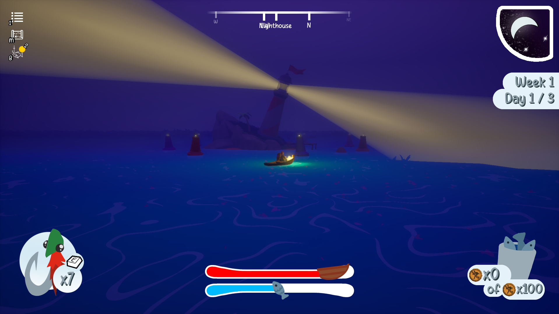 on the standard tech side, i made the day-night system and the quota system, which couple together quite closely (the quota works on a daily and weekly cycle). the day-night manager controls the sky shader and sun position and colour (both of which i was also responsible for), as well as the light in the lighthouse and talking to the UI. the quota manager keeps track of whether the player has met the required amount of money from selling fish each week.